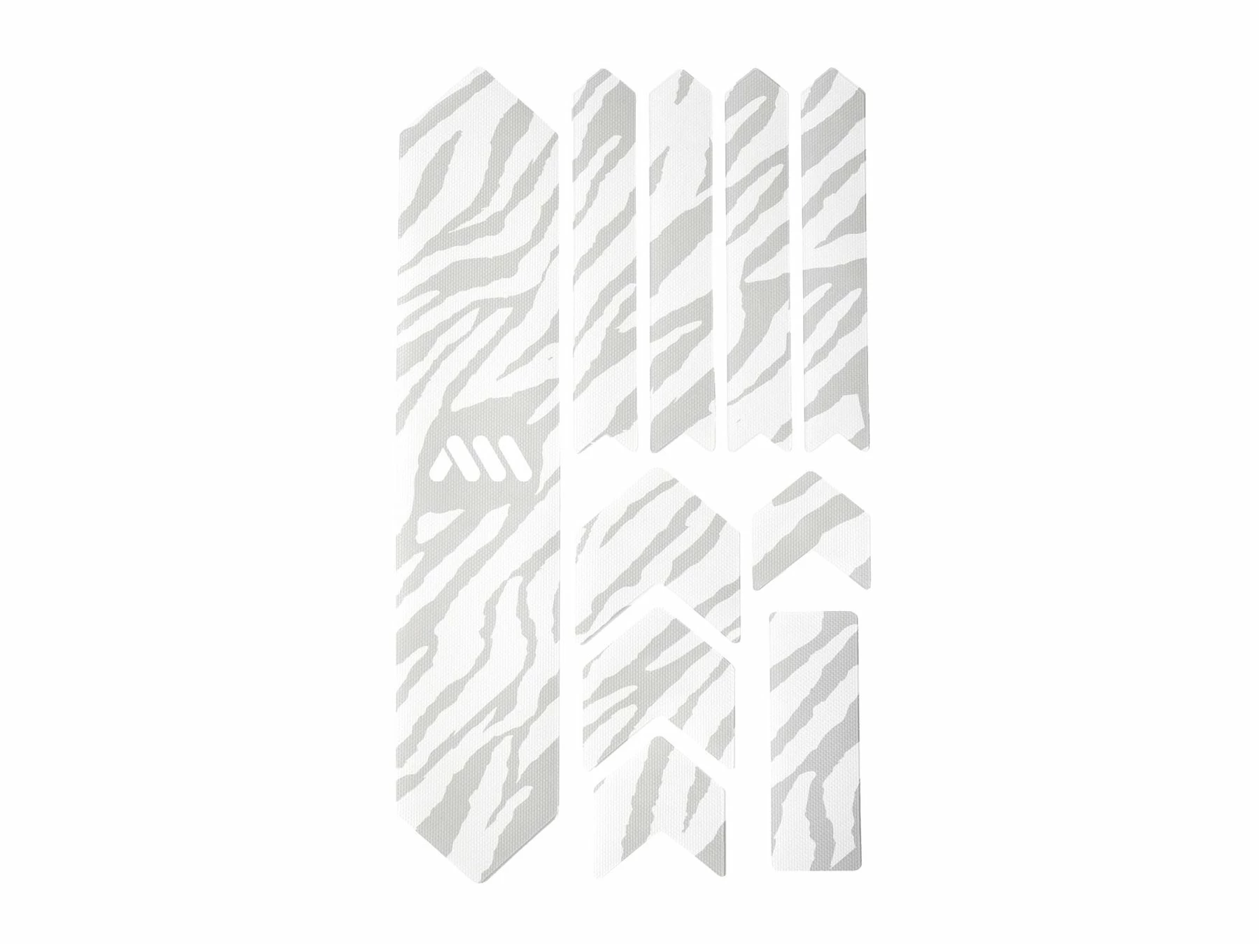 - 10 parts for a universal protection system: 1 big part for the down tube; 4 arrow parts for extending the down tube protection or top tube, 4 parts for the chainstay; 1 rectangle for cable wear protection or other uses.