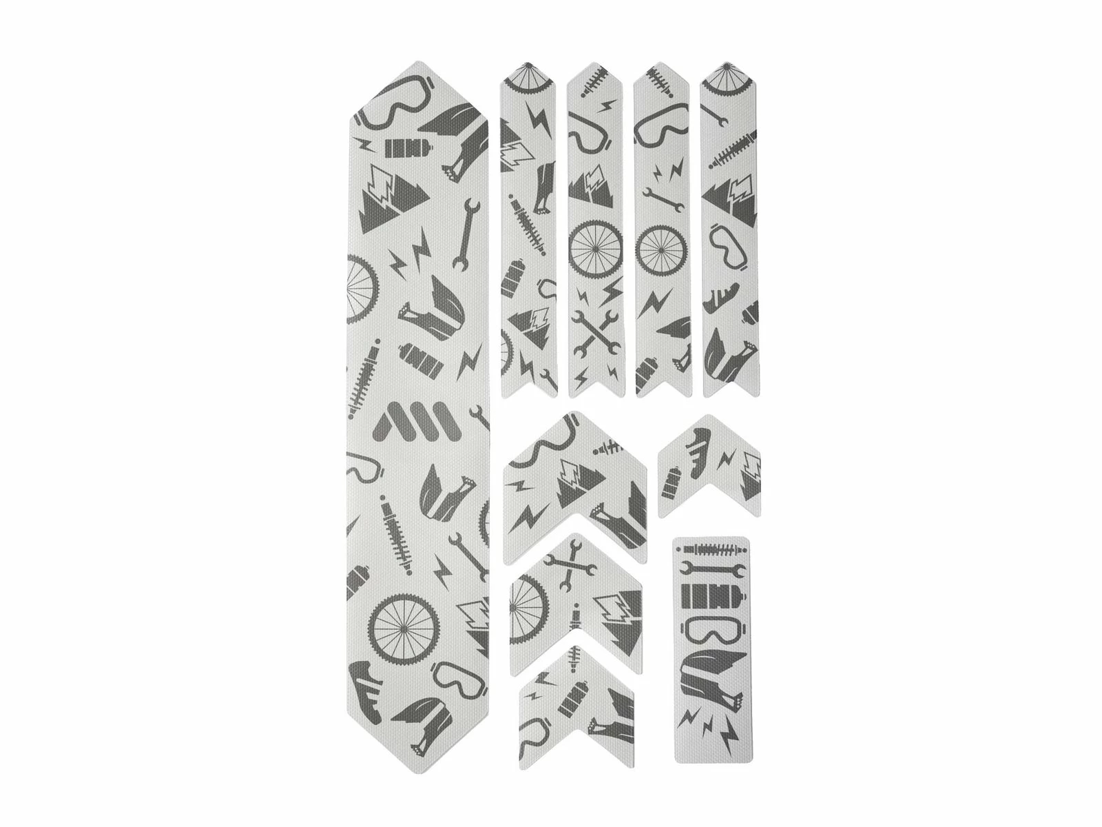 - 10 parts for a universal protection system: 1 big part for the down tube; 4 arrow parts for extending the down tube protection or top tube, 4 parts for the chainstay; 1 rectangle for cable wear protection or other uses.
