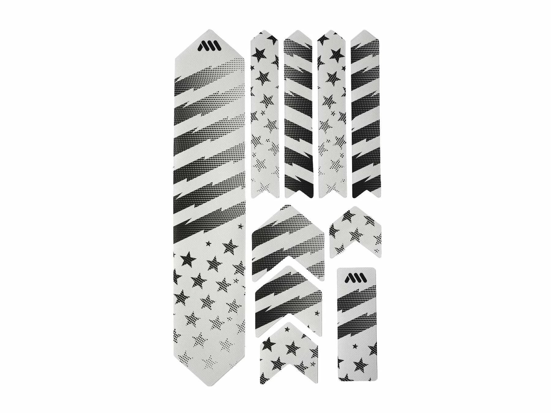 - 10 parts for a universal protection system: 1 big part for the down tube; 4 arrow parts for extending the down tube protection or top tube, 4 parts for the chainstay; 1 rectangle for cable wear protection or other uses.