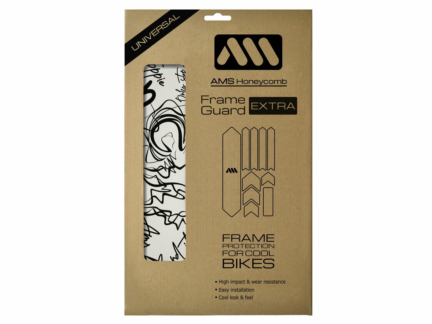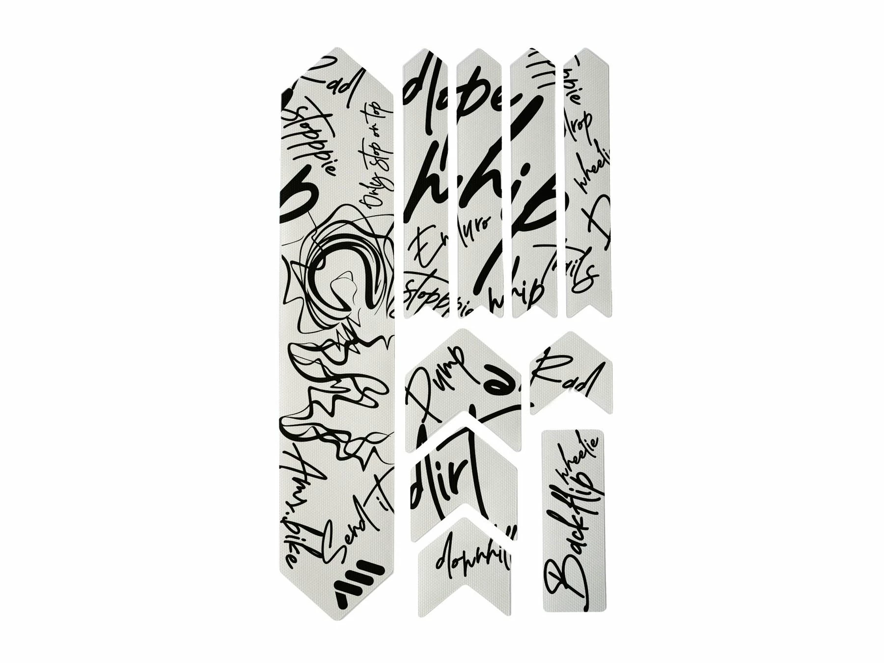 - 10 parts for a universal protection system: 1 big part for the down tube; 4 arrow parts for extending the down tube protection or top tube, 4 parts for the chainstay; 1 rectangle for cable wear protection or other uses.