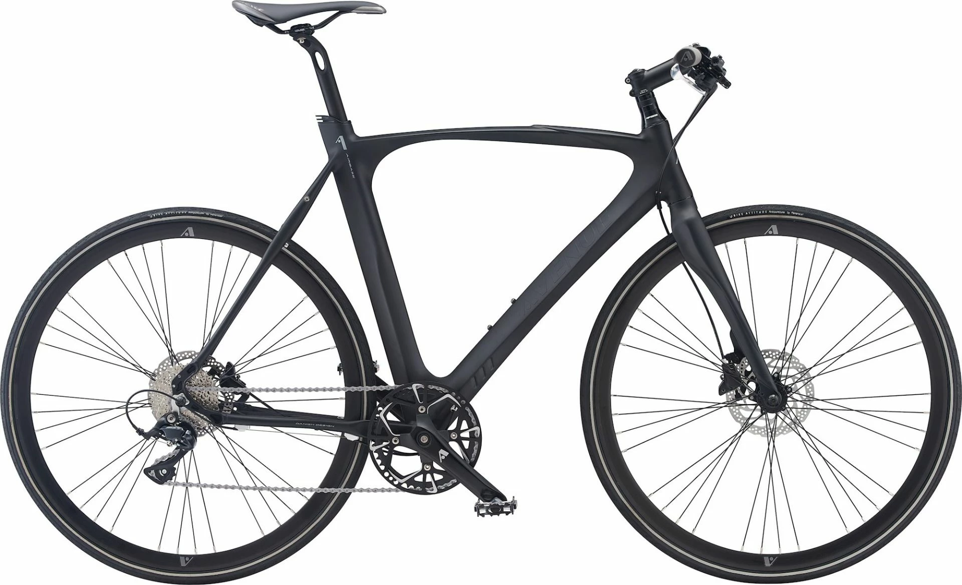 Avenue Airbase Gent er udstyret med et sort aluminiums 46T kranksæt samt Shimano Sora SL-R3000 1×9 skiftegreb på styret og aluminiums frempind.