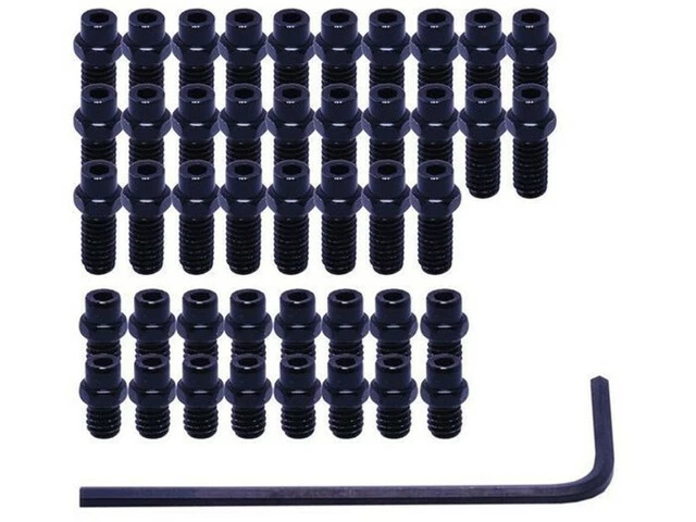 28 x long pins (for use in the outside edge of your pedals) overall length 14.5mm, thread is M4x0.7×10, stud is 4.5mm using either a 5mm spanner or 2mm allen Wrench to secure.