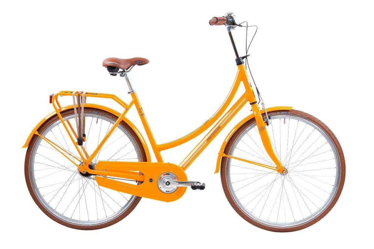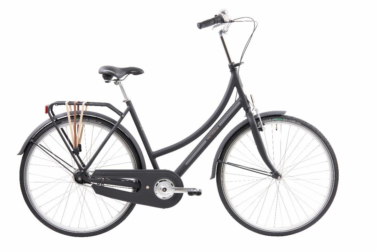 Amsterdam Prestige er bygget på et 6061 aluminiums stel med indfarvede aluminiums skærme til hjul og kæde samt ergonomiske greb.