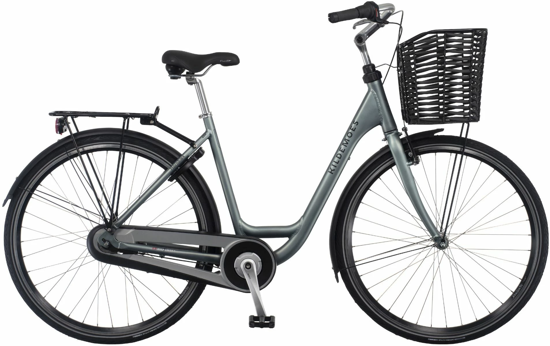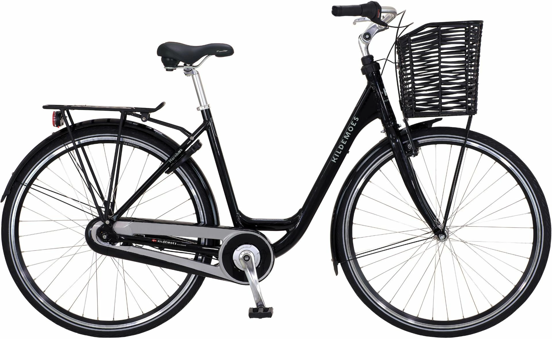 Kildemoes Hornbæk er udstyret med fastmonteret forkurv, batteribaglygte, lukket kædekasse, lås og bagagebærer.