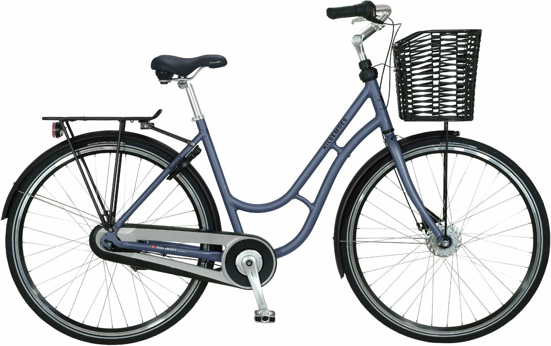 Kildemoes City Nysted shopping cykel til damer med fastmonteret frontkurv i kunstrattan og 7 Shimano Nexus gear samt fodbremse, dynamo og en ekstra rullebremse på forhjulet.