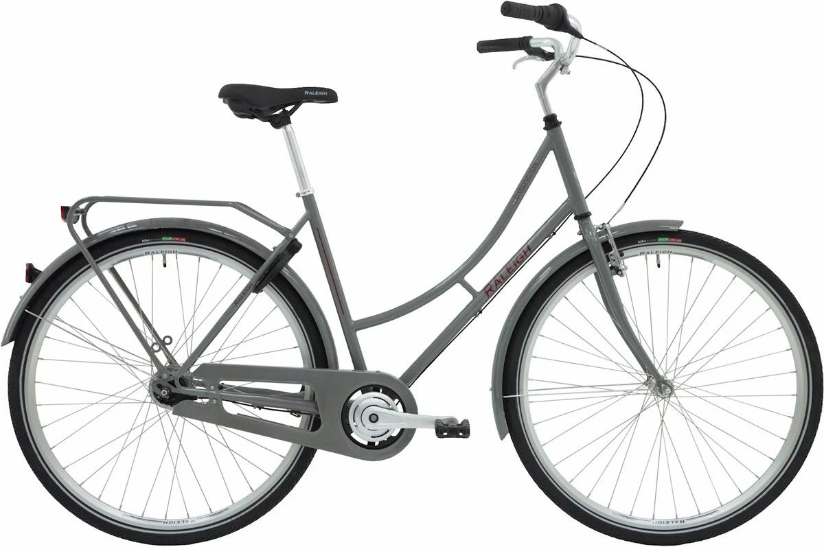 Cyklen leveres med indfarvede skærme til hjul og kæde i stellets farve og bagagebærer samt en sort Raleigh sadel og sorte greb.