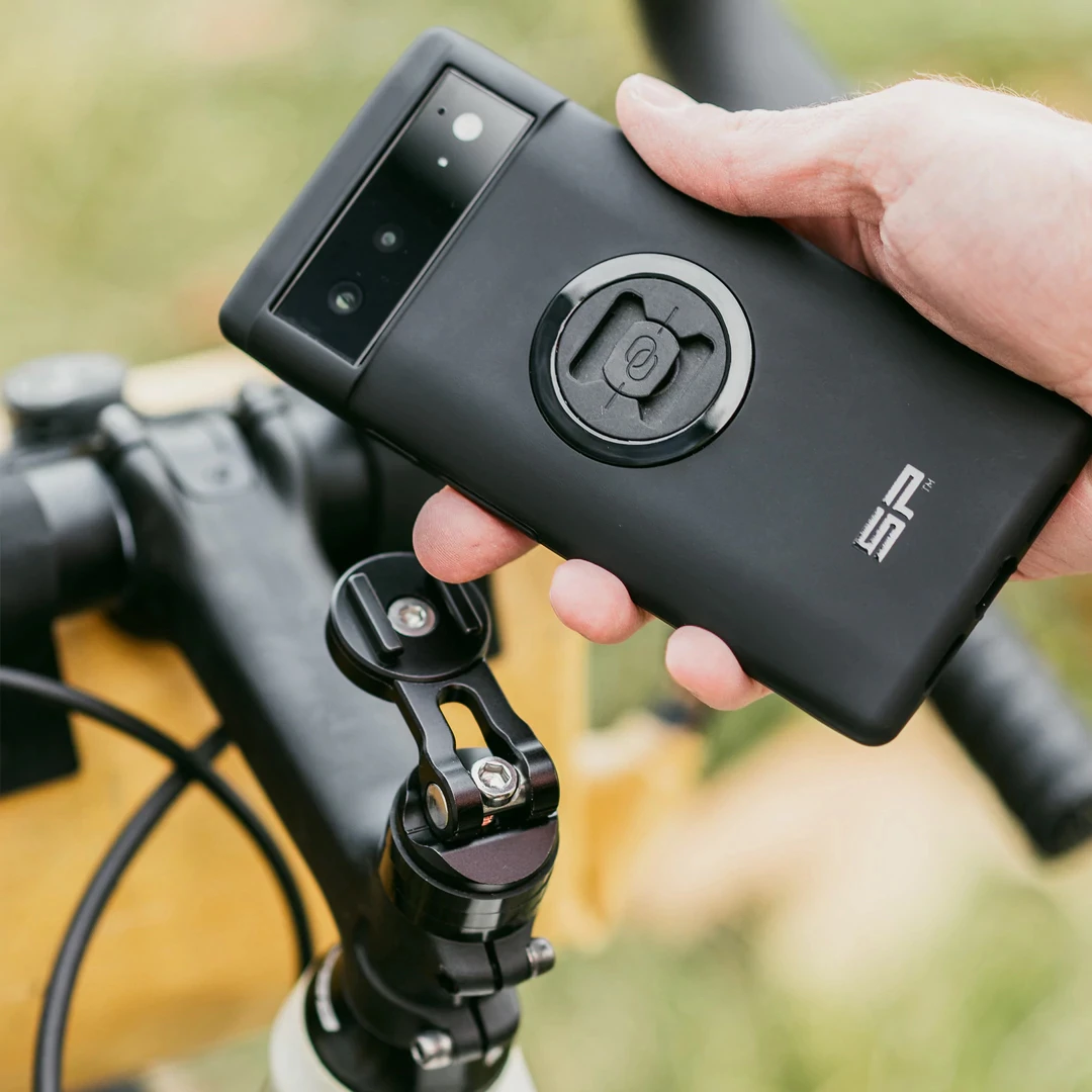 The SP Connect™ STEM MOUNT PRO can be fitted in place of the handlebar stem cap. You can also adjust the mount, made of lightweight aluminum, to an angle so that you can find the best position for your smartphone. With this low-profile mount your mobile phone can of course be mounted in horizontal or vertical orientation. Your smartphone can now easily be attached to your bike with a 90° turn. Your phone is safely positioned in your field of view, allowing you to use apps, access playlists, or just navigate.