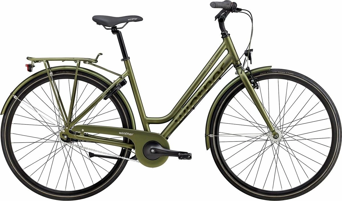 Winther 1 cyklen til damer er bygget på et aluminiums stel med en lav indstigning og mulighed for at indstille kørestilling, med den justerbare aluminiums frempind.